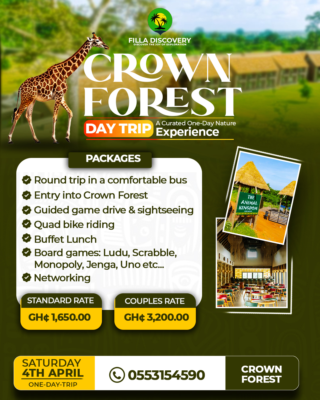 Crown Forest, located at Gomoa Techiam in the Central Region of Ghana, is a serene natural getaway perfect for relaxation, adventure, and outdoor learning. Surrounded by lush greenery and a peaceful forest atmosphere, Crown Forest offers visitors a refreshing escape from the busy city life.